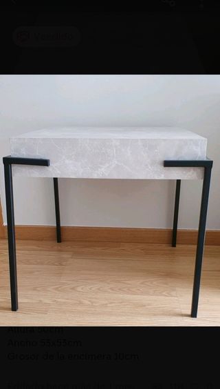 Mesa en tono gris - blanco. Es robusta con patas metálicas en negro. Altura 46cm Ancho 43x43cm Grosor de la encimera 10cm