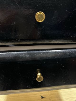 mesita de dos cajones , blanca y negra con toradores dorados