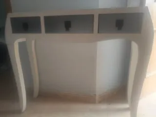 Elegante mesa de entrada con un diseño moderno y funcional. Está muy estropeada, manchada y la pata estropeada. Es para restaurar. - Acabado en color blanco. - Tres cajones con tiradores negros. - Patas curvas de madera.
