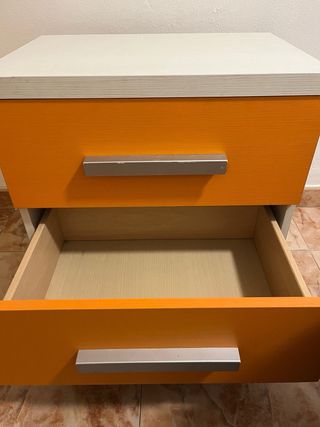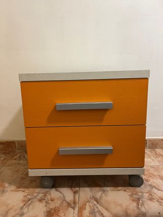 Mesita de noche con un diseño moderno y funcional - Dos cajones amplios para almacenamiento. - Estructura con ruedas para fácil movilidad. - Acabado en color naranja y blanco. - Tiradores de color gris claro