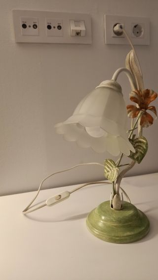 Preciosa lámpara de mesita de noche con forma de flor. Tiene un diseño elegante y delicado. - Pantalla de cristal blanco. - Base de metal en color verde. - Perfecta para cualquier dormitorio.