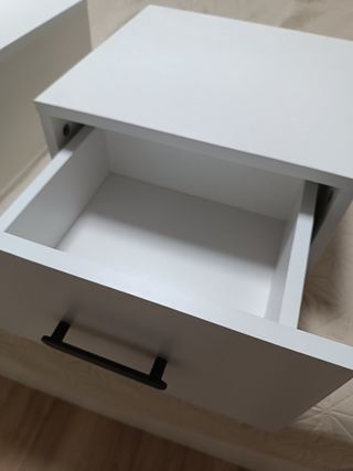Mesita de noche Hauga de Ikea. Tengo dos unidades. Compradas juntas por 50€. Cuenta con un cajón y un espacio de almacenamiento abierto. - Cajón con tirador. - Compartimento inferior para libros o decoración.