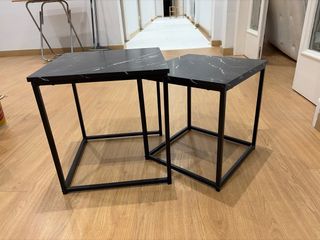 Conjunto de dos mesitas de centro con un diseño moderno y elegante. - Tablero con acabado efecto mármol negro y veteado blanco. - Estructura metálica robusta.