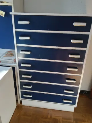 Mueble de almacenaje con diseño moderno. - Cajonera con varios compartimentos. - Combinación de colores azul y blanco. - A juego mesita de noche Todo por 50€