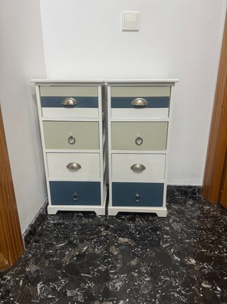 Conjunto de dos mesitas de noche con un diseño moderno y funcional. - Estructura principal de madera. - Tiradores y detalles metálicos. - Combinación de colores azul y blanco.