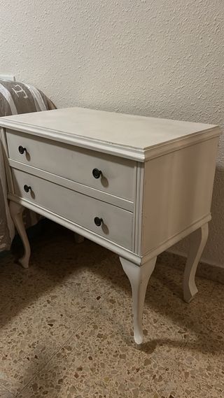 Par de mesitas de noche restauradas y pintadas en un elegante color blanco. Su diseño clásico con patas curvas añade un toque de encanto a cualquier habitación. - Dos cajones con tiradores oscuros. - Acabado pintado a mano.