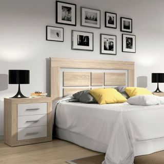 Conjunto de dos cabezales de cama y una mesita de noche. - Fabricados en pino. - Mesita de noche con dos cajones. - Medidas mesita: 40cm de ancho.