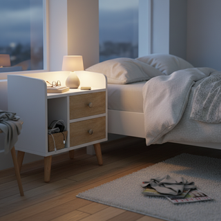 Optimiza el espacio de tu dormitorio con esta elegante mesilla de diseño nórdico. Cuenta con dos cajones amplios y un estante abierto para organizar tus esenciales cómodamente. Destaca por su estructura resistente con patas elevadas de madera de pino y un tamaño compacto de 43x30x49 cm. ✅ Revisado y perfecto REF: 831-296 Referencia del producto: [REF:831-296]