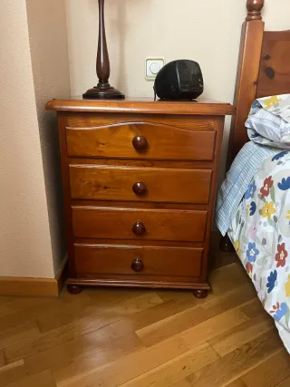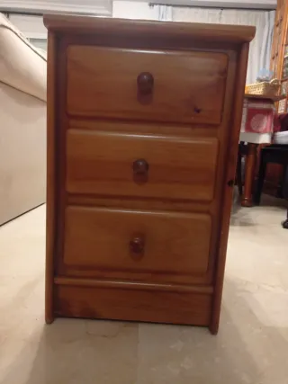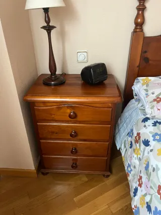 Hola vendo una Mesita de noche con un diseño clásico y elegante, fabricada en madera de pino.40x70 - Cuatro cajones con tiradores redondos. - Patas redondeadas. - Acabado natural de la madera.