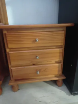 Conjunto de muebles de madera de pino, ideal para dormitorio.Mas mesillas y muebles en mi perfil dispongo de furgoneta - Incluye dos mesitas de noche. - Incluye un sinfonier alto. - Tiradores redondos de madera.