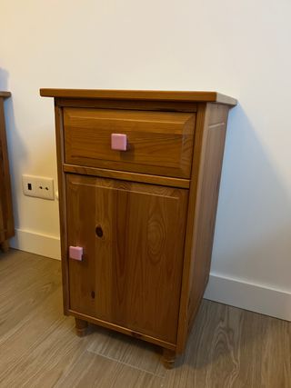 Conjunto de dos mesitas de noche de estilo rústico. Fabricadas en madera de pino, aportan un toque cálido y acogedor a cualquier habitación. - Diseño clásico con un cajón y un armario. - Tiradores blancos de cerámica. Cada una por 12 euros. Las dos por 20.
