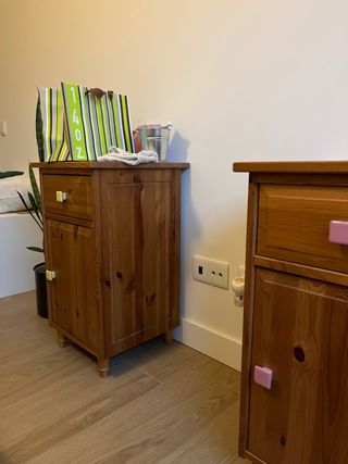 Precio: 35€ cada una (2 disponibles) Mesitas de noche de madera de pino natural, en buen estado. Bonitas, resistentes y prácticas, con espacio de almacenaje. Perfectas para dormitorio o habitación juvenil.