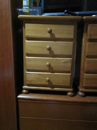 Conjunto de muebles de madera de pino que incluye una cama de 80 (a conjunto con los muebles) que la tengo desmontada y por ahora no tengo foto, un sinfonier al que le pusimos ruedas pero que se pueden sacar, y una mesita de noche. Se vende junto o por separado. Mesita de noche: 35€ Sinfonier o cajonera: 50€ Cama de 80x180cm con cabecero y pie de cama+somier+colchon de espuma: 30€ Todo el conjunto: 100€ Algo negociable, pero no atenderé esas ofertas por la mitad de lo que pides, pongas lo que pongas.
