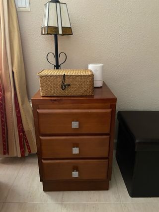 Mesita de noche de madera de pino macizo, color miel. Ideal para dormitorio. - Tres cajones amplios. - Estilo rústico y elegante. - En muy buen estado. Dispongo de dos camas de 80x180 a juego por si interesa. Precio por todo 250€ También tengo dos cómodas a juego