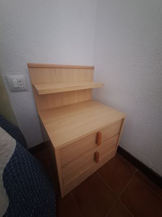 Mesilla dormitorio de madera contrachapada en color pino. Dispone de dos cajones con tirador de madera y un pequeño estante en la parte superior.