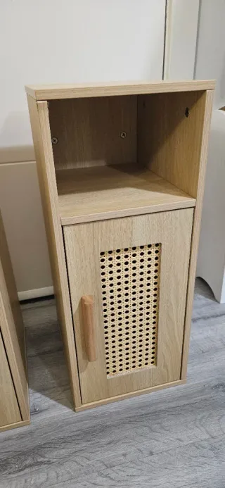 Conjunto de dos mesitas de noche estrechas de 25cm de ancho, con un diseño moderno y natural. - Acabado en madera clara. - Frontales con detalle de ratán. - Tiradores de madera. Estas mesitas están nuevas y sin uso compradas hace poco pero vinieron con esos desperfectos. Perfectas para alguien que desee restaurar o que sepa arreglar ese desperfecto.