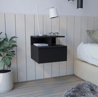 Mesita de noche suspendida con un diseño moderno y elegante. Perfecta para añadir un toque de estilo a tu dormitorio. - Acabado en madera. - Color negro.