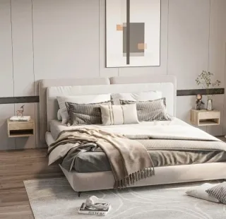 Conjunto de dormitorio en tonos grises y blancos. - Cabecero de 135 cm. - Mesitas de noche flotantes. - Manta de tacto suave.
