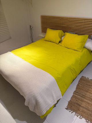 Cama de matrimonio de 150cm x 200cm Son 2 somieres de 80cm x 200cm con un colchón de muelles de 150cm x 200cm y 22cm de grosor También incluyo cabecero de Ikea con mesillas incorporadas de 240cm x 62cm casi nuevo - Cabecero de lamas de madera. - Incluye dos mesitas de noche flotantes. - Estructura de cama con base de lamas de madera. Todo está en muy buen estado Colchón completamente limpio. Cama muy poco usada