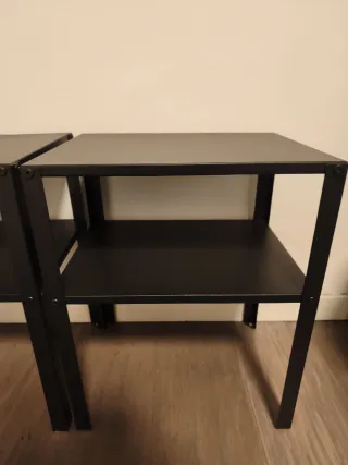 Conjunto de dos mesitas de noche de IKEA. Son prácticas y elegantes para cualquier habitación. - Diseño moderno y minimalista. - Estructura robusta de metal. - Dos niveles de almacenamiento. Prácticamente nuevas, compradas hace poco. Medidas en las fotos. Precio por las dos.