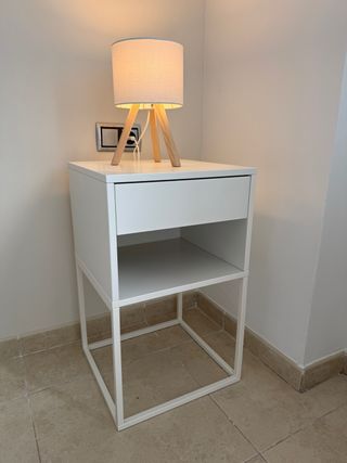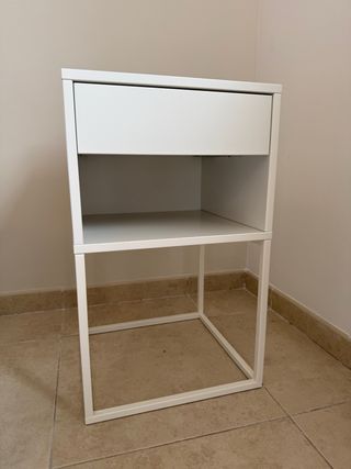 2x Mesitas de noche con un diseño moderno y funcional. - Estructura principal en blanco. - Patas de metal. - Cajón superior de madera. - Espacio abierto inferior. Comprado en agosto de 2025, se vende por mudanza