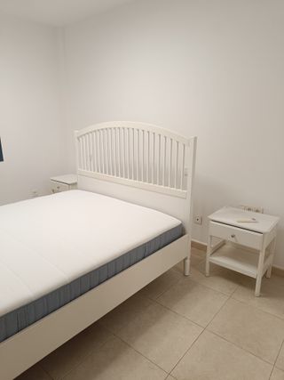 Se vende conjunto de dormitorio completo en color blanco. Con muy poco uso, en perfecto estado. Se compone de: - Estructura de cama con cabecero de barrotes -Colchón de muelles ensacados, firme/azul claro, 160x200 cm (VESTERÖY) - Mesitas de noche con cajón y estante (se incluyen como regalo si se desea)