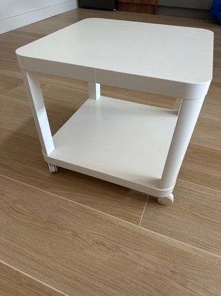 Mesa auxiliar de Ikea, ideal para espacios reducidos. Es de metal y color blanco. - Tiene un diseño sencillo y elegante. - Perfecta como mesita de noche o auxiliar en el salón. - Se encuentra en muy buen estado.