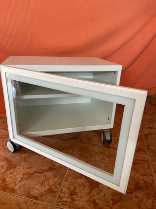 Mesita con puerta de vidrio y ruedas. Tipo auxiliar, TV o mesita de noche. En perfecto estado.