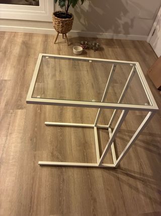 Mesita auxiliar moderna con estructura metálica blanca y sobre de cristal transparente. Diseño ligero y elegante, ideal para salón o dormitorio. En buen estado y fácil de combinar