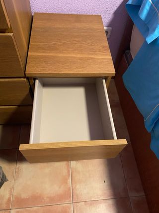 Mesilla de noche con un diseño moderno y funcional. Perfecta para complementar tu dormitorio. - Acabado en madera natural. - Cajones con tiradores integrados. - 2 unidades a 30€ cada una. Recogida en Torrejón de Ardoz