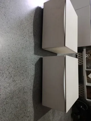 Conjunto de dos mesitas de noche de Ikea. - Diseño moderno y funcional. - Acabado en color beige y blanco. - Amplio cajón - Si vives alrededor de Pamplona te lo acerco