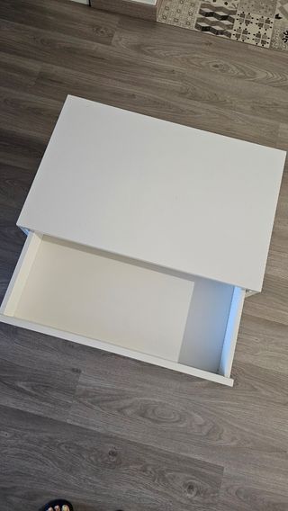 Mesa de noche auxiliar con un diseño sencillo y funcional. Cuenta con un cajón para almacenamiento y una balda inferior. - Acabado en color blanco. - Tirador negro. - Fabricada en madera. En el Ikea valen 60€ cada una y están las dos nuevas.