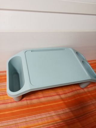 Mesa para cama, para el portátil, desayunar, ESTA NUEVA, tiene dos compartimentos grandes para poner cosas, y un compartimento redondo para vasos. Diseñada para ofrecer comodidad y versatilidad y fácil de limpiar. De plástico alto impacto. - Bandeja principal espaciosa - Patas estables para mayor seguridad. El Ordenador que se ve en la foto no está incluido y no está en venta. Largo 52cm Ancho 31cm Alto 20cm ENTREGO EN MANO