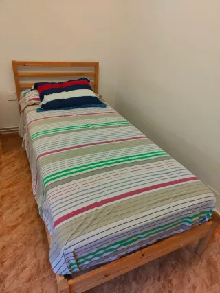 Se vende cama individual con estructura de madera y colchón. Mesita de noche a conjunto. - Estructura de madera. Està desmontado listo para llevar.