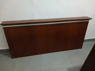 Se vende cabezal de matrimonio junto con una mesita de noche. - Diseño elegante y moderno. - Acabado en madera oscura.