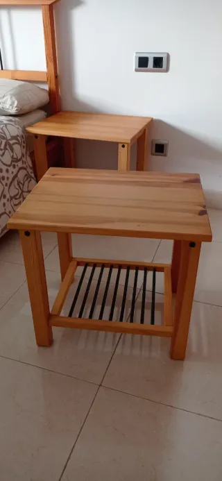 Conjunto de dos mesitas de noche con un diseño sencillo y elegante. Están en muy buen estado. - Madera de pino barnizada. - Estante inferior de metal negro. - Medidas 50 x 40 cm. - Altura 45,5 cm. - Se pueden colocar tanto de ancho como de largo. - Modelo DALSELV de IKEA, ya descatalogado. - Montaje muy sencillo. Se entregan desmontadas junto con los tornillos y la llave "Allen" necesaria. Las tengo empaquetadas para poder enviar o recoger en Barcelona de manera fácil .