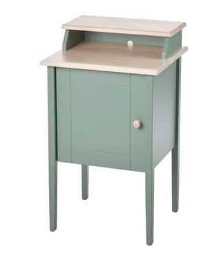 Mesita de noche "ordelndalen" de ikea (descatalogada). Material: madera de pino macizo, color verde con madera natural. - Diseño de dos niveles. - Puerta con tirador de madera. En perfecto estado. Precio por mesa: 65€. Dos diponibles