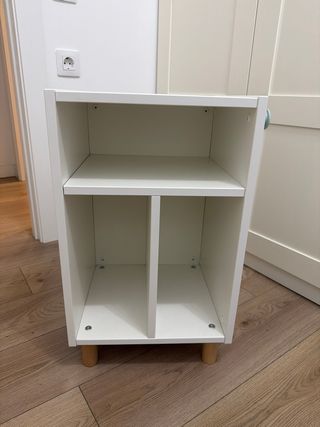 Mesita de noche con un diseño moderno y funcional. Perfecta para tener a mano tus objetos personales. - Dos baldas para almacenamiento. - Patas de madera para un toque cálido. - Estructura de madera y plástico. Precio original de 40 euros con menos de 1 año de uso y en perfecto estado como se puede observar (aún mantiene etiqueta en parte trasera)