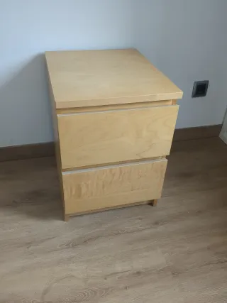 Mesita de noche de madera de Ikea con dos cajones amplios. Los cajones tienen rieles y topes. Las medidas son: - Ancho: 40 cm - Profundo: 48 cm - Alto: 55 cm - Dos cajones de gran capacidad. - Acabado en madera clara.