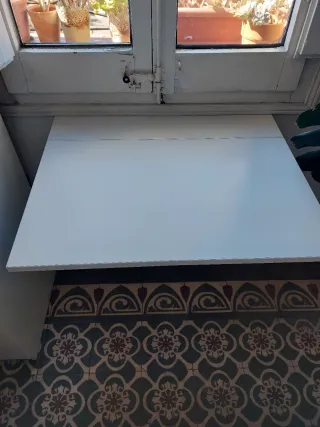 Mesa plegable de pared de diseño moderno, ideal para espacios reducidos. Su acabado blanco le da un toque elegante. - Diseño compacto y funcional. - Fácil de montar y plegar - Medidas en la ultima foto. - Materiales: Plástico y madera.