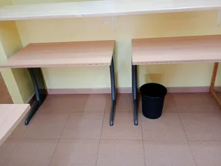 6 mesas de clase con superficie de madera y patas de metal, material muy resistente y de larga durabilidad. - Diseño moderno y funcional. - Combina colores beige y gris para un estilo versátil. - 60€ Unidad - Poco negociable
