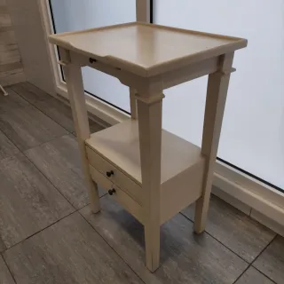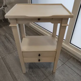 Encantadora mesita de noche con un diseño vintage y detalles ornamentales. - Acabado en madera con toques blancos. - Patas curvas elegantes. - Cajones con tiradores redondos. Son dos mesitas de noche y cada una 50€