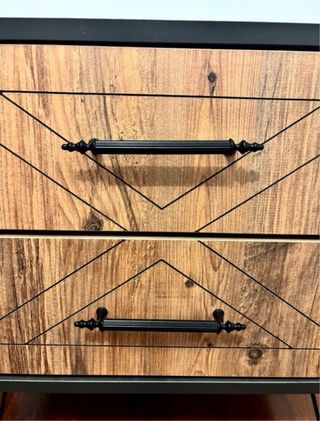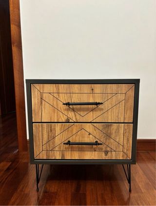 Mesilla de noche con un diseño moderno y funcional. - Acabado en madera con detalles geométricos. - Estructura metálica resistente. - Dos cajones amplios para almacenamiento. ** TIENE DOS PIQUES EN EL INTERIOR DEL PRIMER CAJON. Adjunto foto