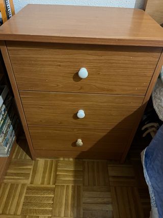 Mesilla de noche de madera con tres cajones. - tres cajones. - Tiradores metálicos. Tiene algunos toques. Está en Arrasate. Mesilla de noche, mesita, cajonera, dormitorio, habitación.