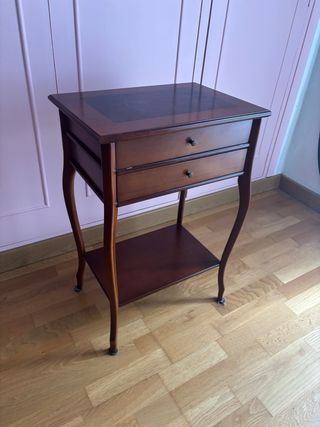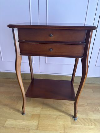 Preciosa mesita auxiliar de madera, ideal para cualquier habitación. Se encuentra en muy buen estado. - Tres cajones funcionales. - Un estante abierto. - Acabado brillante. Medidas: 0,77 alto 0,40 ancho y 27 de fondo.