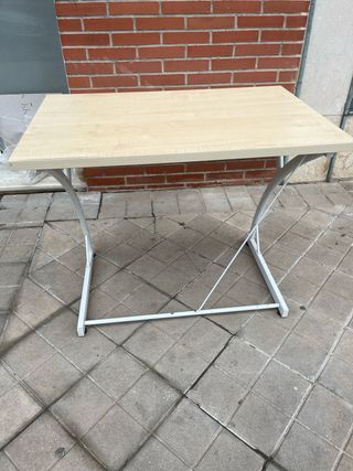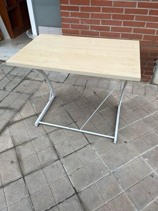 Mesa auxiliar con un diseño moderno y funcional. - Tablero de madera en tono claro. - Patas metálicas en color blanco.