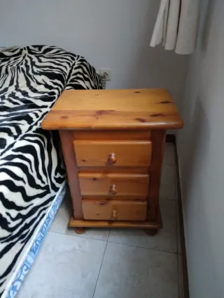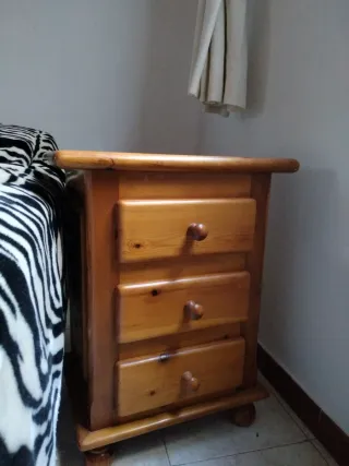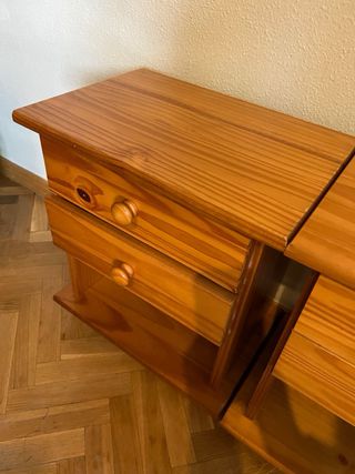 Vendo pareja de mesillas de noche de madera maciza, de estilo rústico. Muy resistentes y funcionales, con dos cajones amplios cada una y tiradores de madera. Ideales para dormitorio, casa de campo o como proyecto de restauración. Una de las mesillas presenta el tablero superior más claro por desgaste natural, lo que también permite lijar y barnizar ambas para dejarlas como nuevas o personalizarlas al gusto. Estado general bueno, con señales normales de uso visibles en las fotos. 📍 Recogida en mano