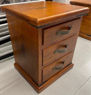 LIQUIDACION MESITA DE NOCHE DE PINO RESISTENTE Mesita de noche de pino macizo, muy resistente y con un acabado rústico. - Diseño robusto y duradero. - Cajones con tiradores metálicos. - Acabado en tono miel. Tenemos en conjunto, sinfonier, comoda, cama y mas Pagas cuando la recibas Garantia Hacemos envios rapidos y economicos el precio es por cada una