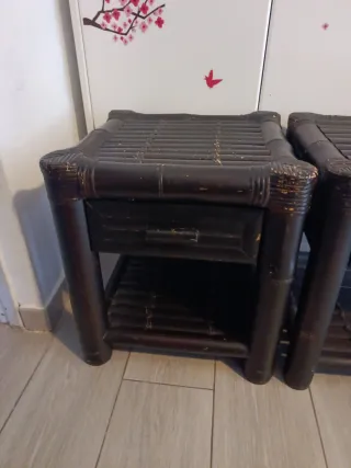 Conjunto de dos mesitas de noche con un diseño rústico y natural. - Fabricadas en bambú. - Cada mesita cuenta con un cajón. - Disponen de un estante inferior adicional. Están en buen estado, sólo tienen un poco gastada la pintura por alguna zona. Se pueden pintar o cambiar de color. El color negro que trae es el original que tenía cuando las compré en la tienda. Nuevas costaron 80€ cada una. Son robustas. El precio de 40€es por las 2 juntas.