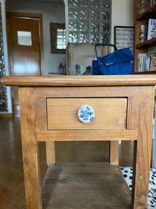 Encantadora mesita auxiliar de estilo rústico y vintage, perfecta para añadir un toque de calidez a cualquier espacio. - Fabricada en madera. - Tirador decorado con un diseño floral en tonos azules y blancos. RECOGIDA POR CUENTA PROPIA.